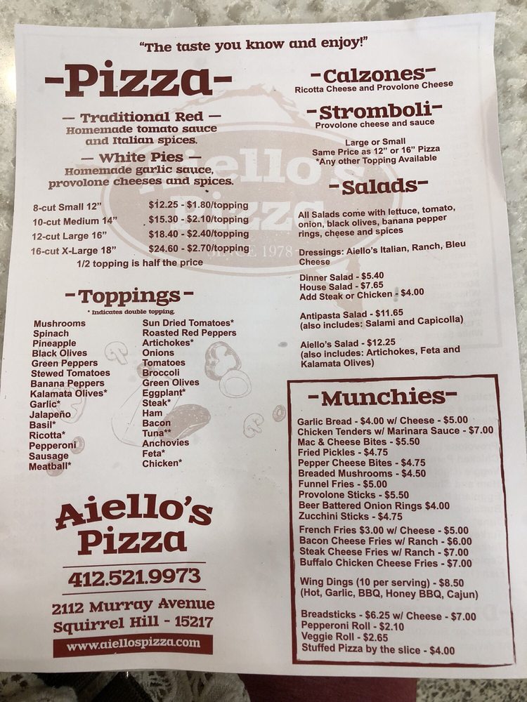 Welcome to Aiello's Pizza Squirrel Hill, a delightful Italian pizzeria nestled in Pittsburgh, where every bite tells a story. Their menu caters to a variety of palates, offering everything from classic thin-crust pizzas to mouthwatering hoagies. With both vegan and vegetarian options, there’s something for everyone.